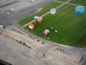During the main part of the flight, the winds peacefully float us along while we would take in the scenery, and marval at the miniature homes, traffic, people, horses, and dogs spread out beneath us. The dogs. Dogs simply just do not like hot air balloons. For two years, I lived in the typical flight path of the “box” effect (see below). My dogs, as well as all the neighbors dogs, were literally crazed… running back and forth constantly in a barking frenzy. During the fiesta, the majority of responsible dog owners simply bring their pets inside during the morning flights. When lofting in the air that day, I must admit that watching the dogs go crazy was mildly amusing. From the dogs point of view, a large strange behemoth approaches from above frequently putting out a thunderous blast. Dogs duty: run, bark, and chase… must rid the skies of this beast overhead. Threat floats off. Job completed. Do not get me wrong, I have raised and trained dogs my entire life, and am a true hard-core dog-lover. But there is always humor in everyday life, and watching the miniature dogs from above was entertaining.