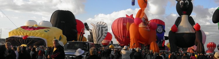 Box Effect: Part of the reason for the success of the Fiesta are the cool Albuquerque morning temperatures in October and the Albuquerque box. The “box” is a set of predictable wind patterns that can be exploited to navigate the balloons. At low elevations the winds tend to be southerly (from the south), but at higher elevations they tend to be northerly. Balloonists use these winds to navigate in a vertical box: they ascend slightly from the launch park, move south, ascend further, move north, descend, and repeat the box or land back in the launch park or quite nearby. During events involving on-field targets, such as the “Key Grab” (where pilots attempt to grab prizes, including a set of keys to a new vehicle, from atop tall, flexible poles), it’s not uncommon to see the same balloon make 5 or 6 passes at the targets, simply by working the “Box” to keep returning to the field.