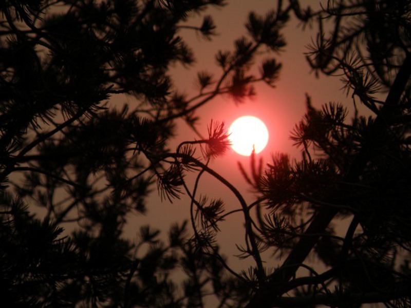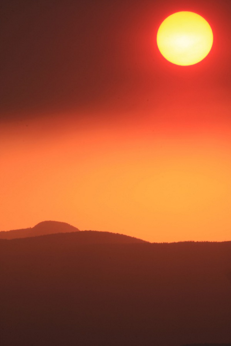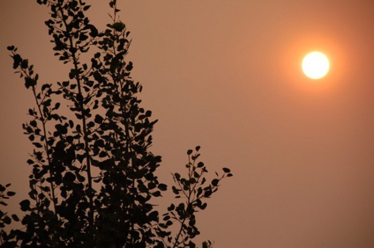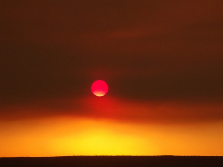 The first picture was taken by me from my backyard tonight at approximately 7:15 PM. The sun was not due to set until 8:20. I did not use any filters, no special settings, nor was this touched up in Photoshop. The red coloring is from the smoke layer filtering out certain color wavelengths. Which is also the reason for the various colors in the rest of the images. The video above was also taken at the same time, same place.