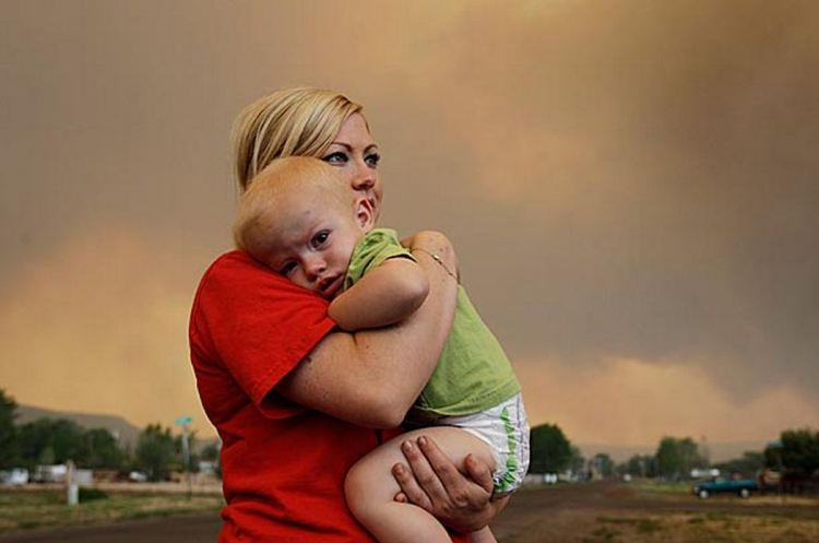 Emily Shupe comforts her 18-month-old son Jax as the family prepares to evacuate to Phoenix from Springerville, Ariz., on June 7, 2011 MARCIO JOSE SANCHEZ AP