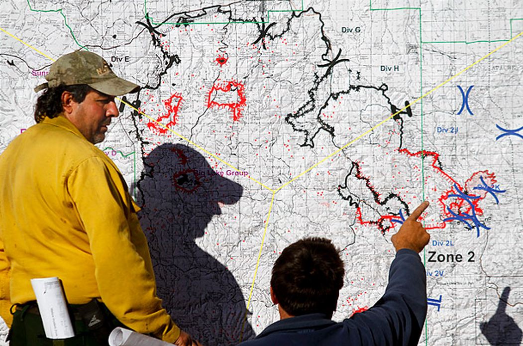 Fire officials look over a map of the Wallow wildfire in Eagar, Ariz., on June 22, 2011 JOSHUA LOTT THE NEW YORK TIMES