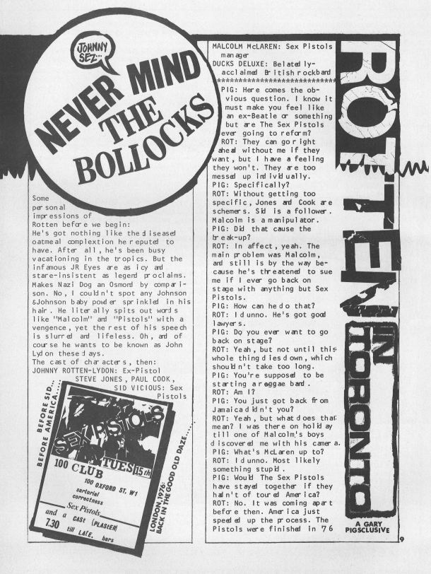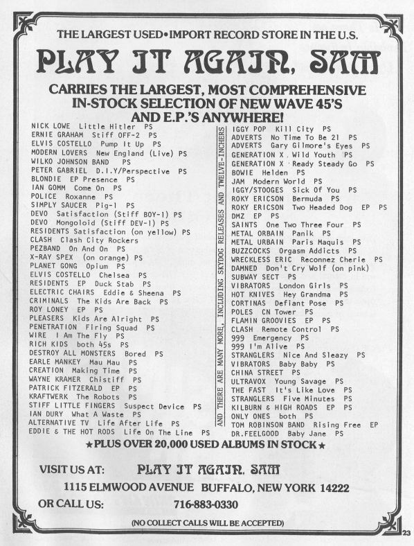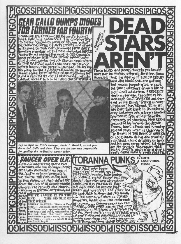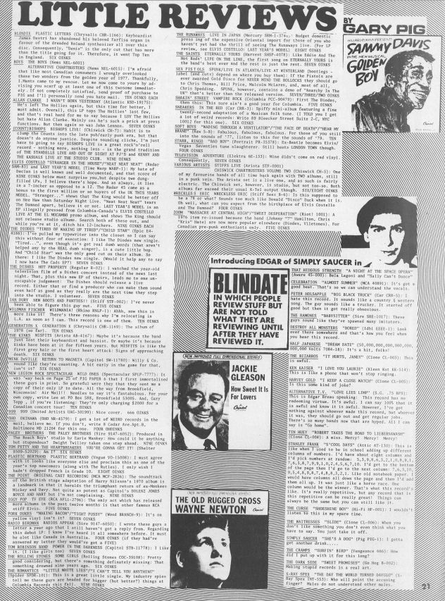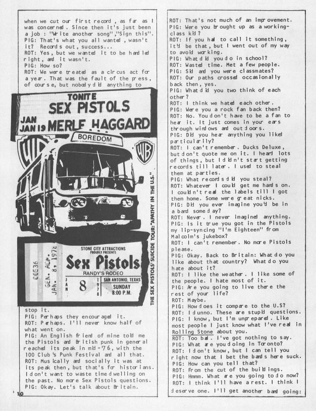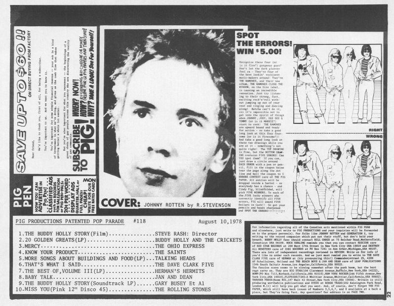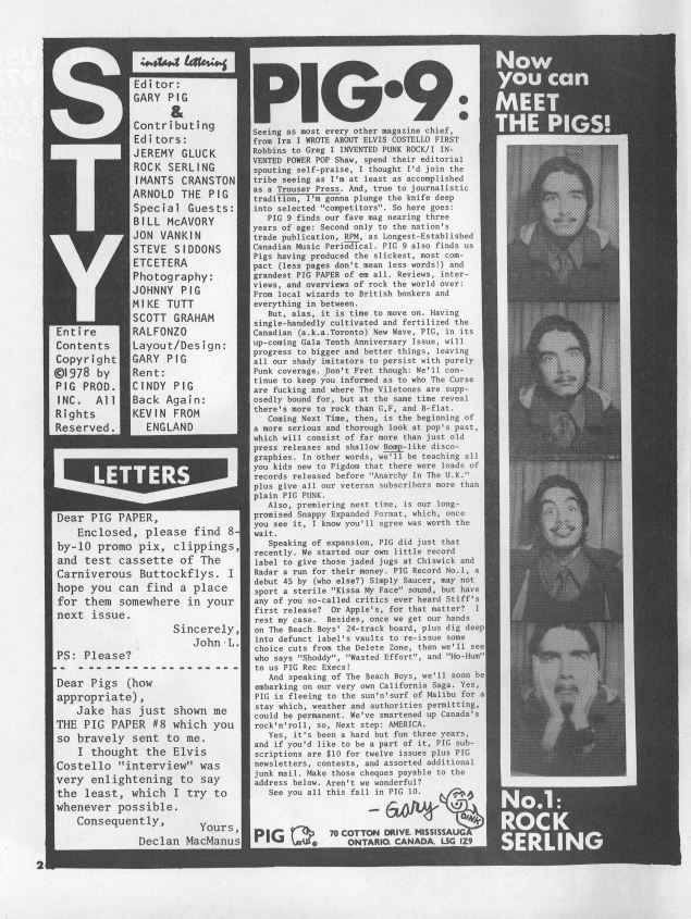 Interviews with John Lydon and Generation X, articles on Suicide, Buddy Holly, and Destroy All Monsters, “Pig Toronto Punk Discography,” Bill McAvory on the Ugly Ducklings, Edgar Breau plays “Blindate,” plus record reviews of David Johansen, Wild Man Fischer, Blondie, Mink DeVille, the Paley Brothers, Tom Petty, the Romantics, Television, Soft Boys, Ringo Starr, Ian Dury, and many more.