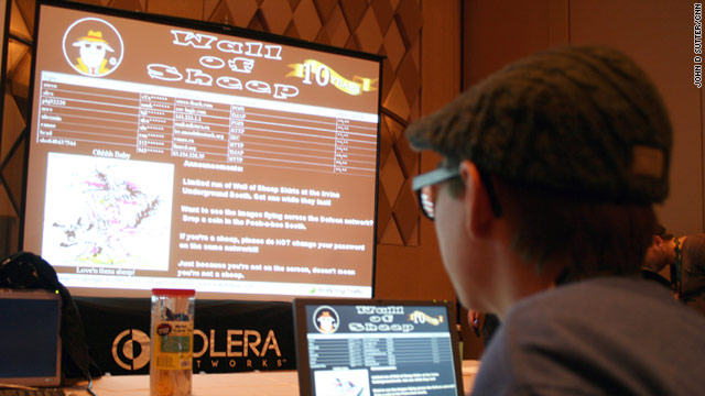 Markus, for example, sits in a dark room in the Rio’s conference center watching Internet traffic. When he sees a password fly across the connection, which is often, he posts part of it, along with the user’s log-in name and the site he or she was using, on a large projection screen, which he calls the “Wall of Sheep” (pictured above).
