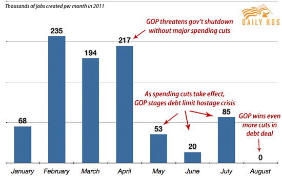 This chart, from Daily Kos, shows how the job growth significantly dropped – with zero growth for August – when the Republicans took control of the agenda.