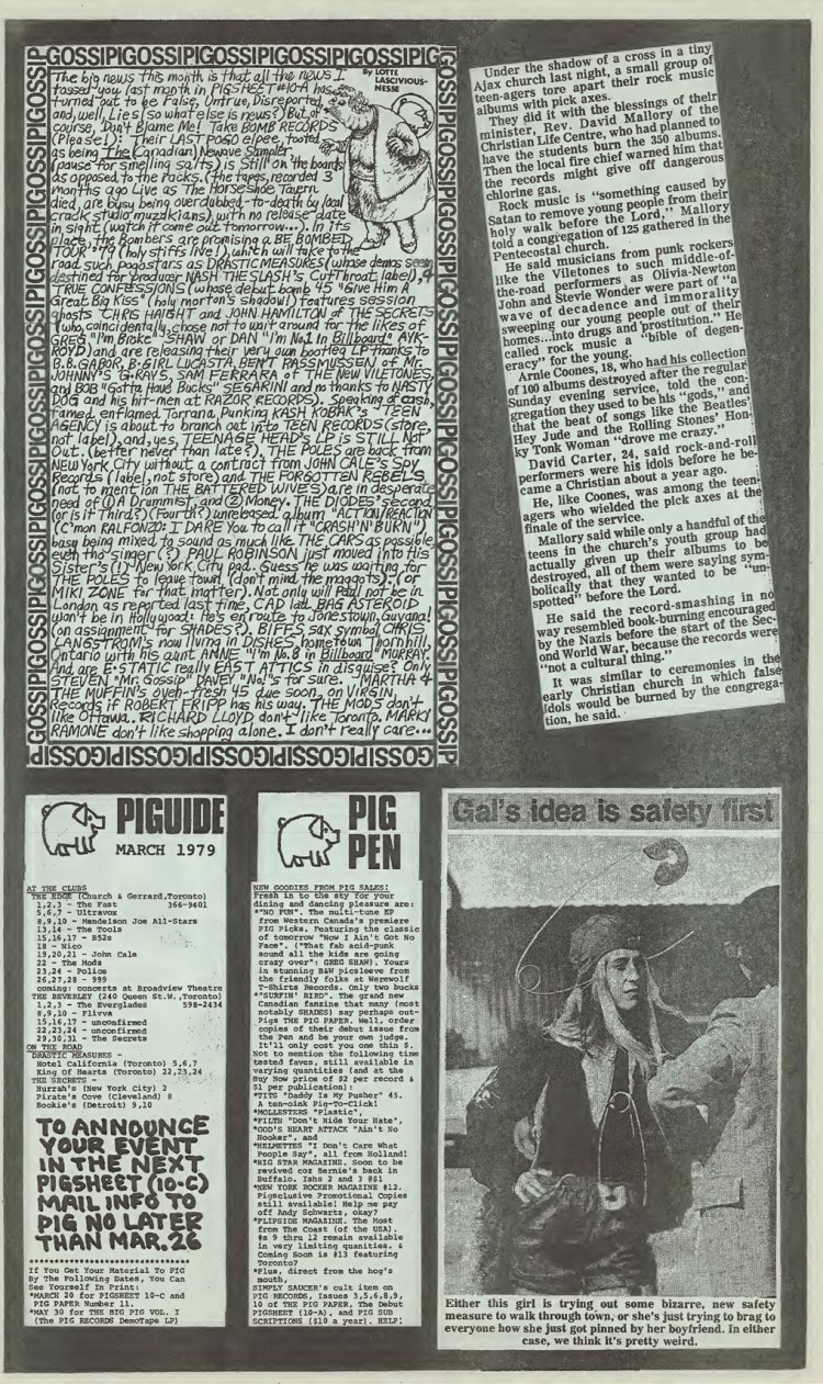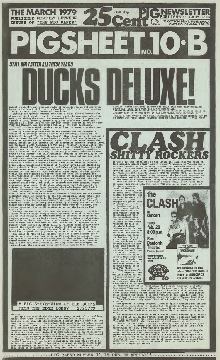 This issue of the Pig Paper came out March 1979 and features the Ugly Ducklings and punk gossip in Toronto.