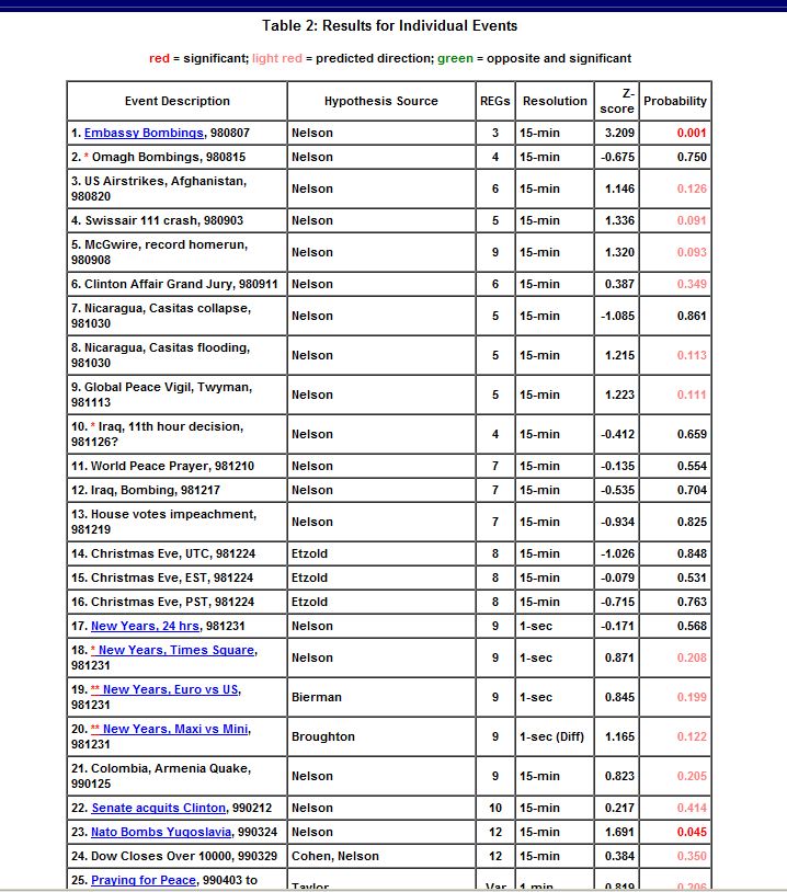In my previous posting, I challenged Princeton to send me more information about their EGG’s not having predicted other worldly catastrophic events. Well, they didn’t – which I never expected – but I did find a posting on their GCP site listing what they feel are a long list of events which corresponded with the flux in data accumulated at that point in time. Here is an snapshot image from their site. This is an IMAGE so the hyperlinks are not linked… click here to go to see the full list.