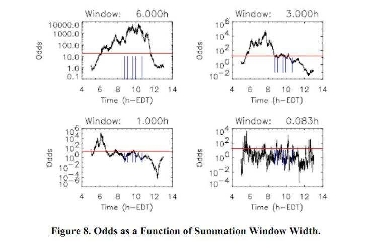 By viewing the above charts, with the odds at 6 hours, the spikes occur at similar times to the major times of tragedy of 9/11. If you use an over all curve, it is primarily one bell curve during the 9/11 duration. Now, adjust the odds to 3 and 1 hour(s), peak occur prior to 9/11. At 8.3 minutes, nothing really stands out.