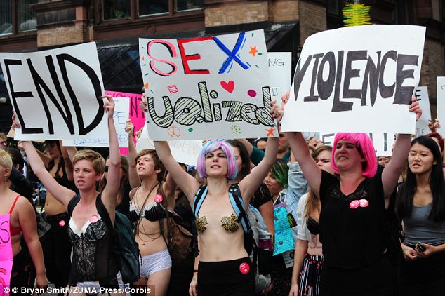 Some women and men who protest dress in nothing more remarkable than jeans and T-shirts, while others wear provocative or revealing outfits to bring attention to ‘slut-shaming,’ or shaming women for being sexual, and the treatment of sexual assault victims.