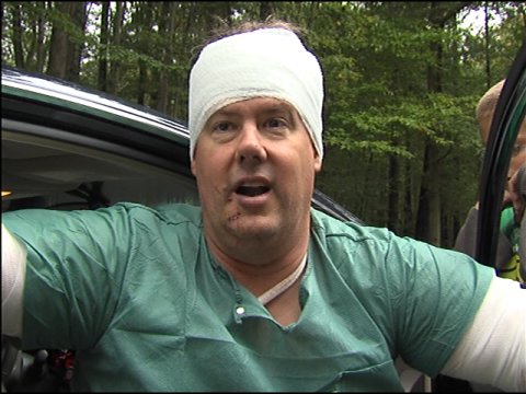 “I know what it’s like to be a salmon now,” he joked after the couple came home from a hospital Monday afternoon in bandages and medical scrubs.