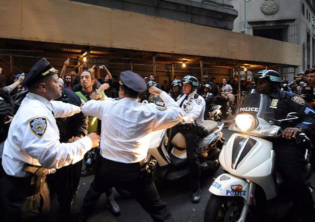 (Below) New York police officers clash with protesters. Photograph: Mary Altaffer/AP