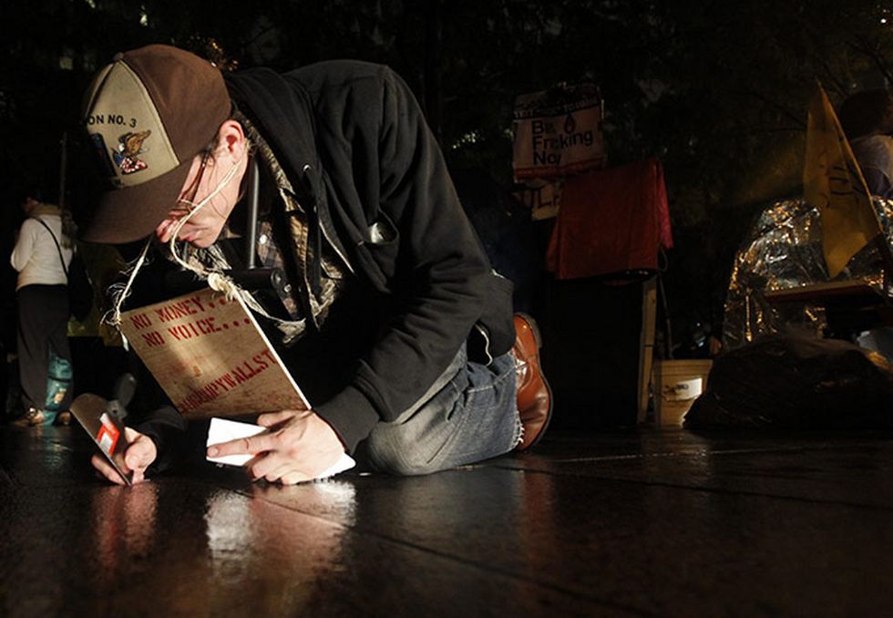 (Below) A protester scrapes paint off the pavement. Photograph: Jessica Rinaldi/Reuters