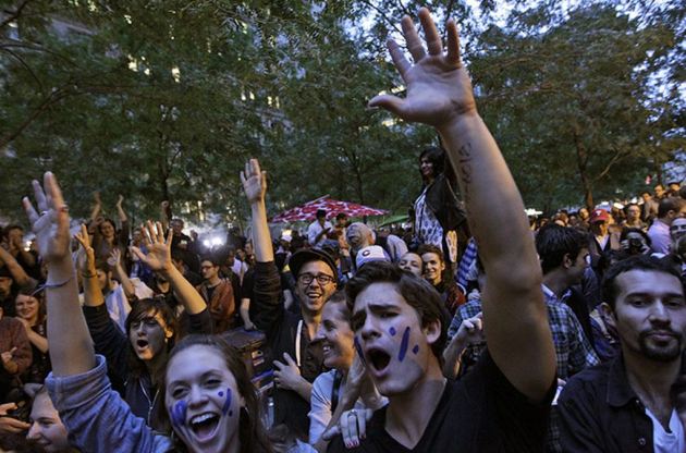 (Below) Protesters celebrate following the announcement that they would not have to leave the park. Photograph: Mary Altaffer/AP