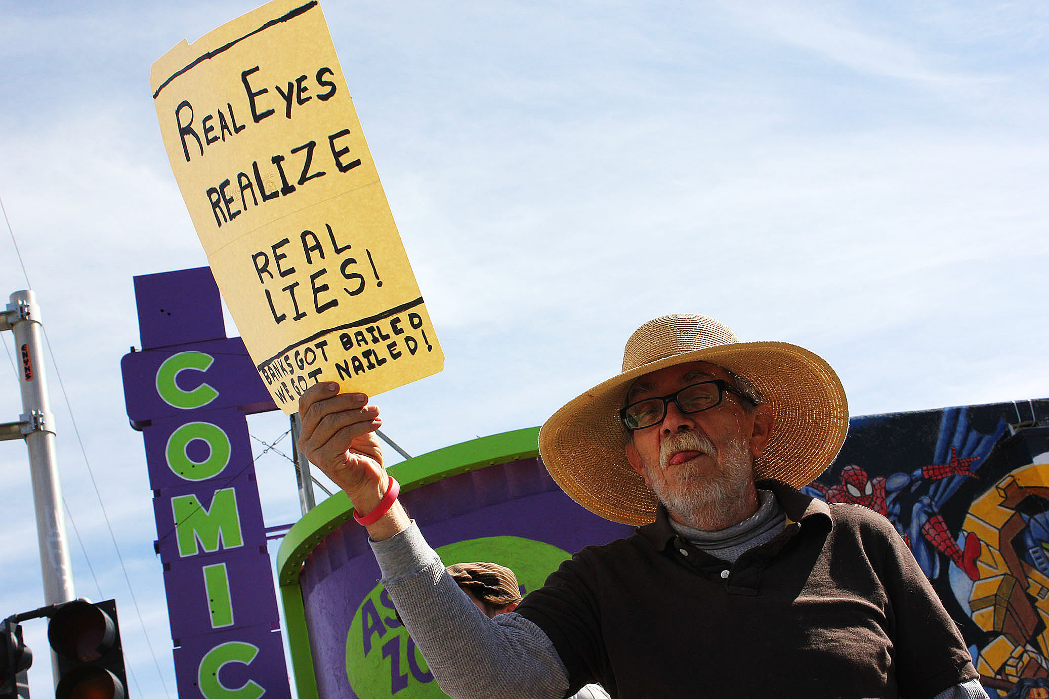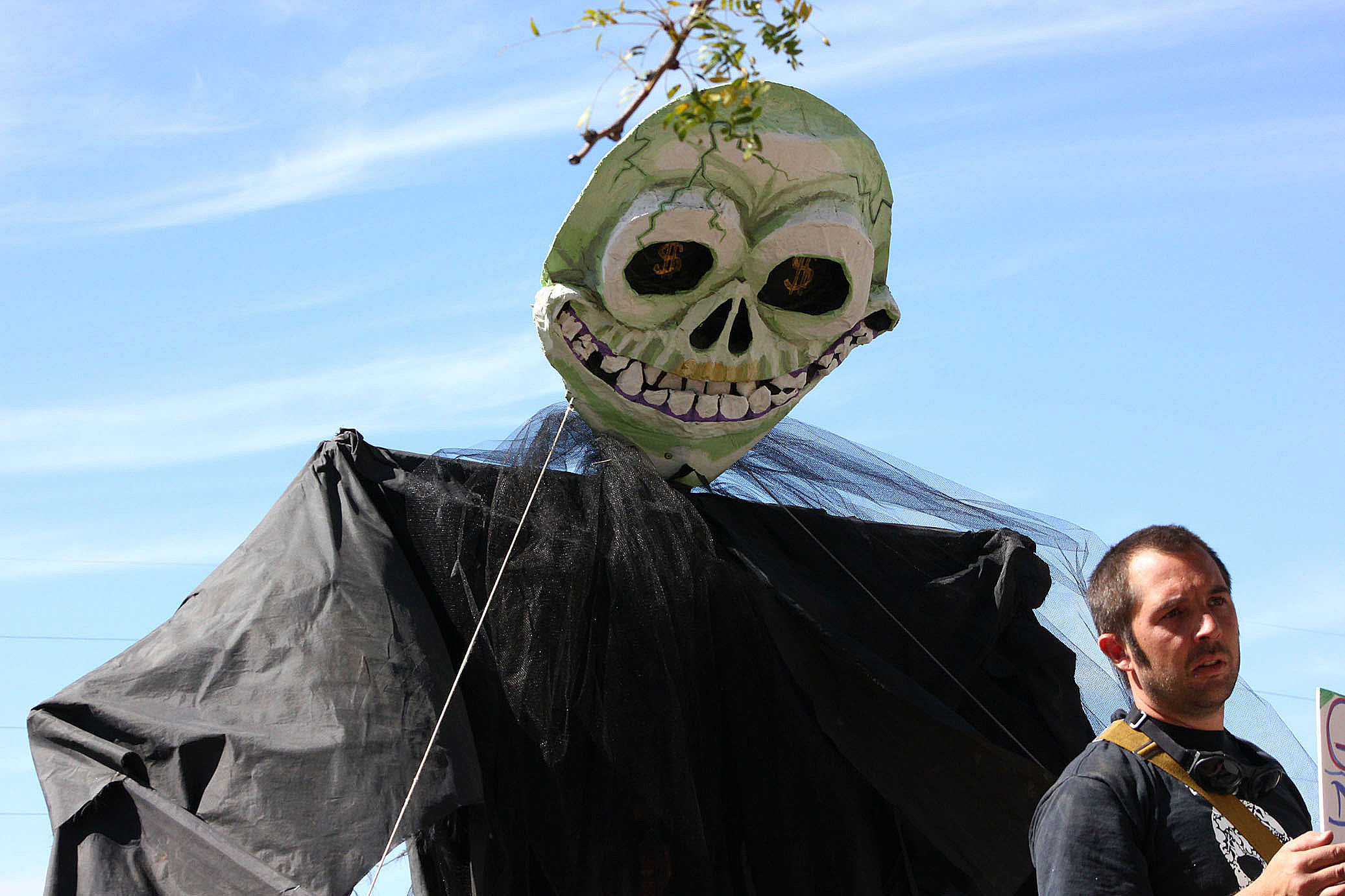 Today was a most phenomenal day! I arrived early at Coyote Camp and shortly before the scheduled noon protest at Wells-Fargo in Nob Hill, we gathered together to march as one to the meeting point. There were approximately 75 of us leaving from Coyote Camp. When the rest of the protest came into view, it was a glorious site… hundreds and hundreds had already gathered! It is difficult to estimate the size of a crowd constantly in motion, but I would estimate there were upwards to 800 people at peak time. All ages, socioeconomic backgrounds, etc. You name it, they were there! A perfect representation of the people today within the 99 percent.