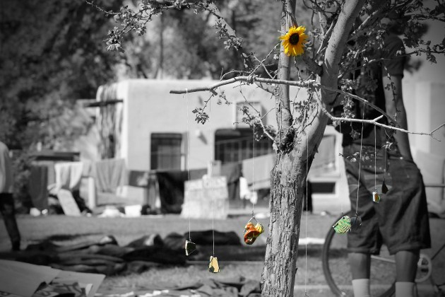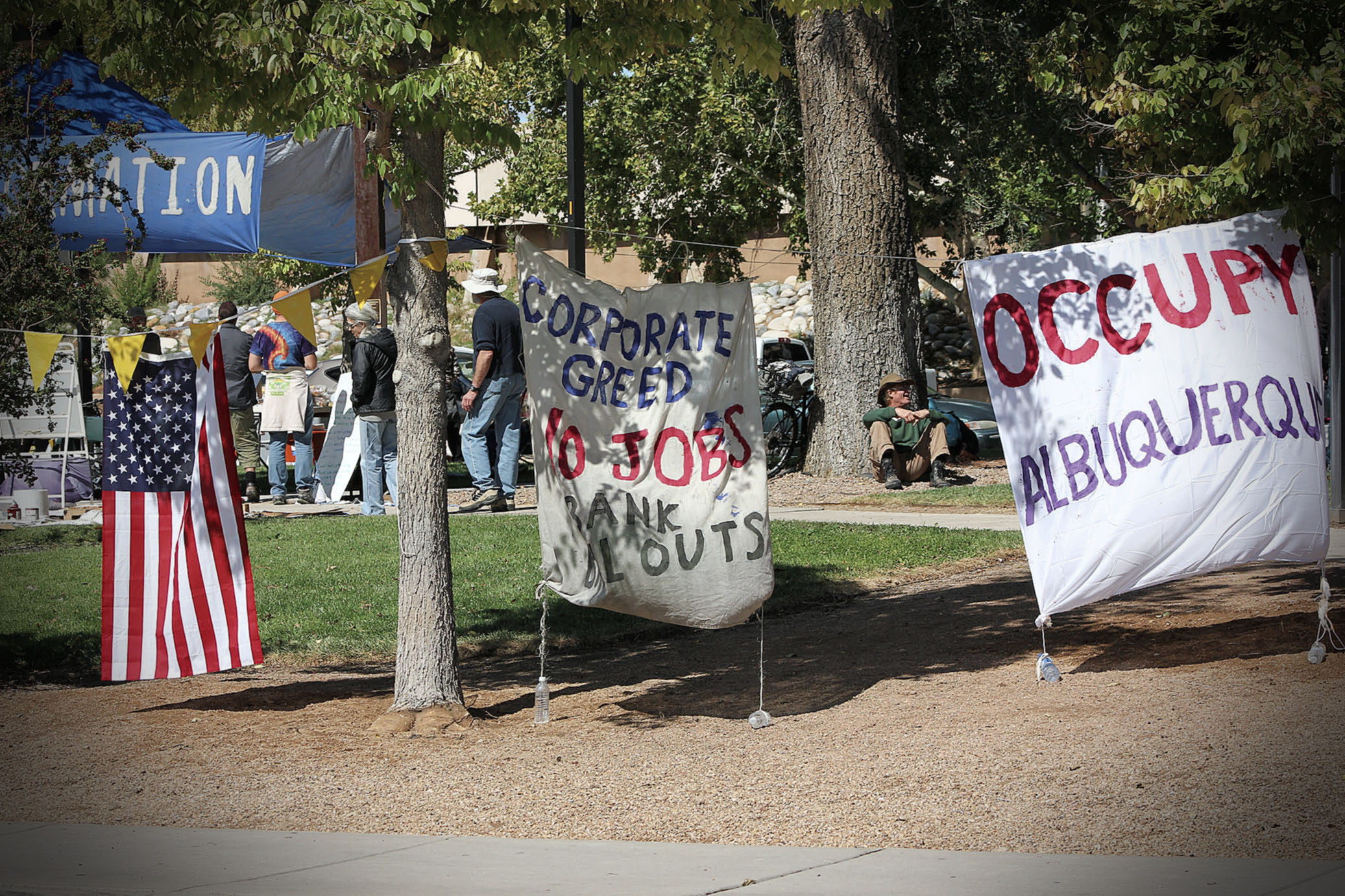 Occupy Albuquerque has been functioning a base camp, called Coyote Camp, on the UNM campus since October 1st.  Initially the camp set up on the corner of University and Central, but UNM granted a permit to move Coyote Camp to it’s current location at Yale Park on the corner of Central and Yale.