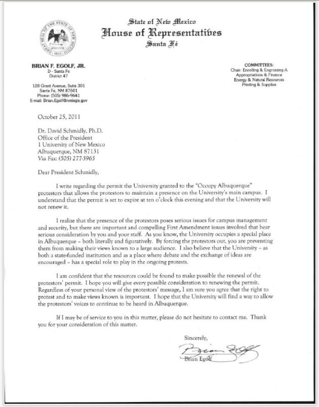 NM State Rep Brian Egolf Jr pens letter to UNM Pres Schmidly to allow protesters to remain #occupyburque #ows