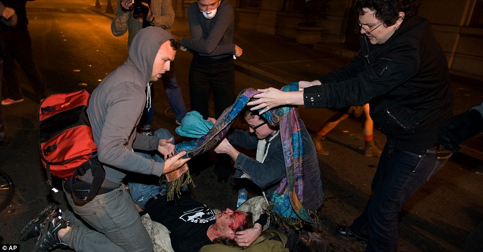 (Below) Bloodied: Violence broke out in running battles between police and protesters as they tried to retake the camp in Frank Ogawa Plaza which was earlier in the day.