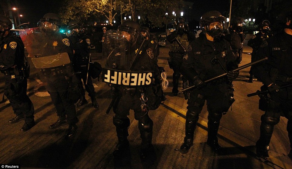 Police gave repeated warnings to demonstrators to disperse from the entrance to Frank Ogawa Plaza in the Californian city before firing tear gas canisters into the crowd at 7:45pm on Tuesday evening. There were reports from officers that some protesters had been throwing rocks.