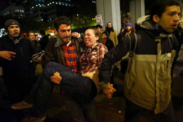 Seattle Post-Intelligencer photographer Joshua Trujillo snapped a picture (see below) of Fox in apparent agony as another activist carried her to an ambulance.