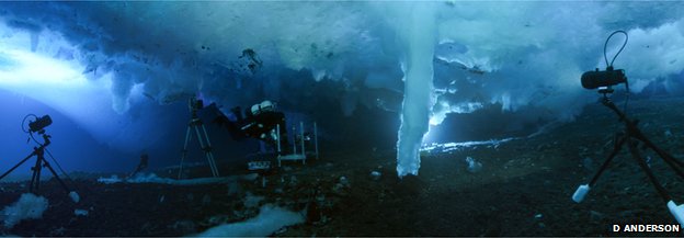 Mr Miller set up the rig of timelapse equipment to capture the growing brinicle under the ice at Little Razorback Island, near Antarctica’s Ross Archipelago.