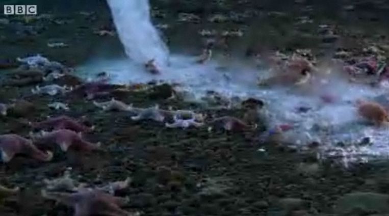 Where the so-called “brinicle” met the sea bed, a web of ice formed that froze everything it touched, including sea urchins and starfish.