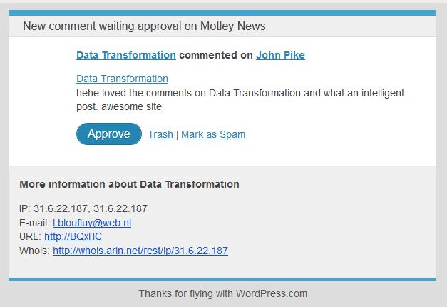 Nice… very nice. Starting out with the “hehe” really was good idea as that very well would be a typical start to a comment from a real person who is legitimately commenting. But the “data transformation” reference stopped me as I’ve never posted on that. Then noticed the IP and other details. Definite spam. What made me laugh, though, was where the comment was posted to….
