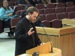 Father Nathan Monk wasn’t laughing at last night’s City Council meeting. During the Boyd Forum, an open comment period named in honor of the late civic activist LeRoy Boyd, Father Monk chided the council members — and Council President Sam Hall in particular — for their actions at Monday’s Committee of the Whole meeting. At that meeting, several citizens had spoken in opposition to the proposed anti-homeless ordinances, and in doing so made unflattering comparisons to historical figures (one person mentioned Heinrich Himmler’s “Final Solution”) and questioned the Christian charity of any council member who would support the ordinances. Council members DeWeese and Johnson took offense at the accusations, and Hall had asked Police Chief Chip Simmons to remove several speakers he deemed “out of order.”
