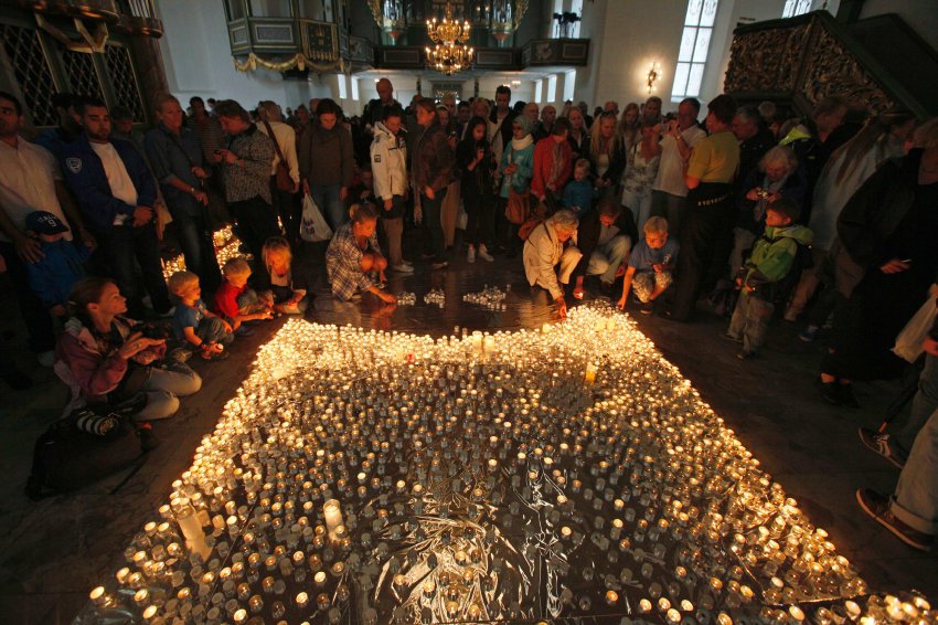 Grieving members of the public lit candles after a memorial service inside the Oslo Cathedral July 24, 2011. Norway mourned on Sunday 93 people killed in a shooting spree and car bombing by a Norwegian who saw his attacks as "atrocious, but necessary" to defeat liberal immigration policies and the spread of Islam. | REUTERS/Wolfgang Rattay | Source: Spiegel