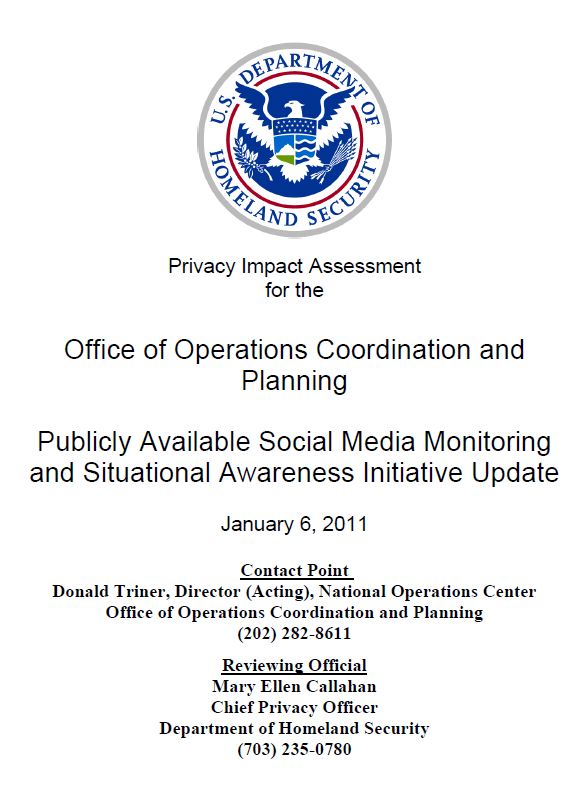 From the Department of Homeland Security (DHS) website is a pdf copy, published January 6, 2011, which includes the sites and keywords being watched by the Office of Operations Coordination and Planning (OPS) and National Operations Center (NOC) in cooperation with the DHS.