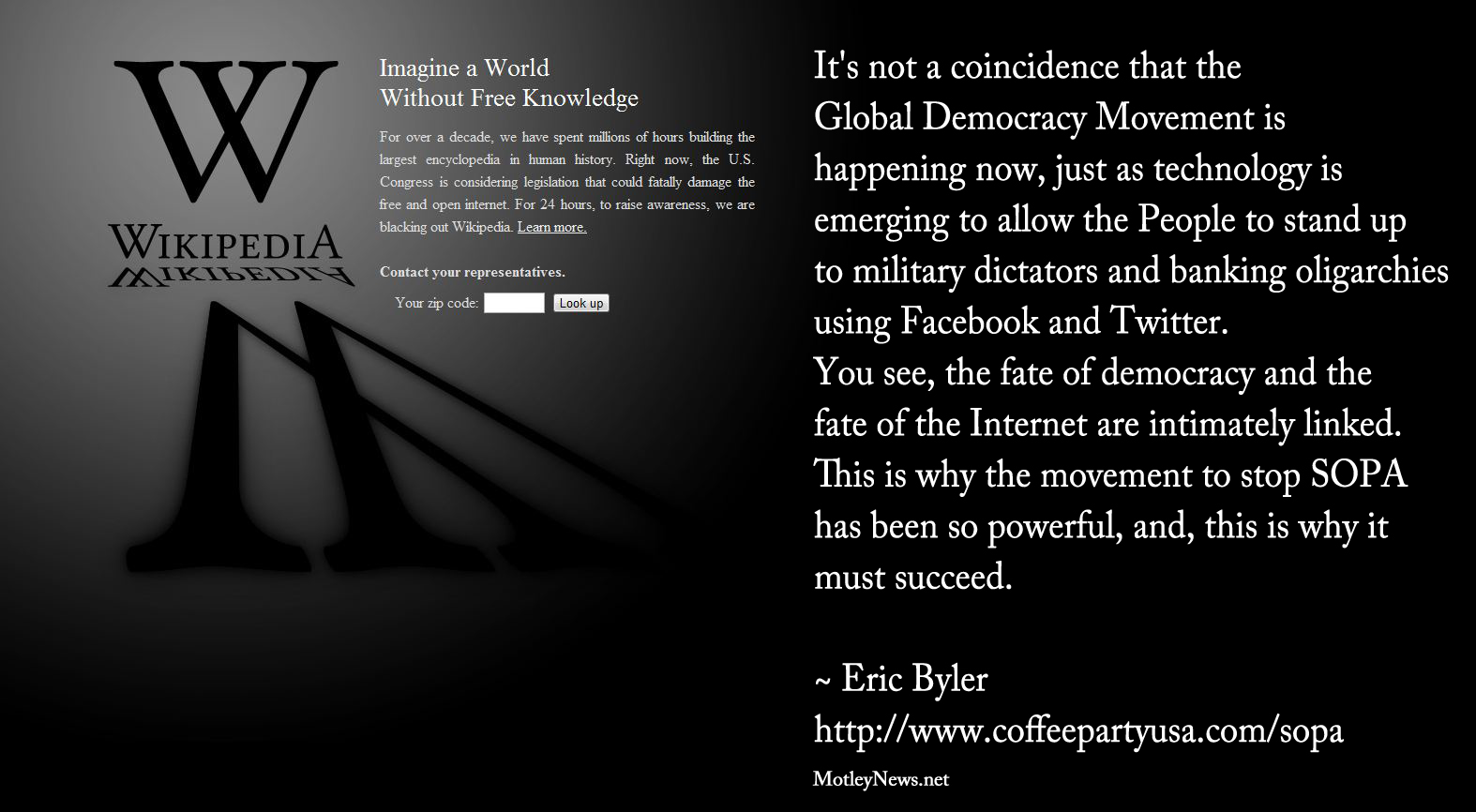 It’s not a coincidence that the Global Democracy Movement is happening now, just as technology is emerging to allow the People to stand up to military dictators and banking oligarchies using Facebook and Twitter.  You see, the fate of democracy and the fate of the Internet are intimately linked.  This is why the movement to stop SOPA has been so powerful, and, this is why it must succeed. ~ Eric Byler http://www.coffeepartyusa.com/sopa