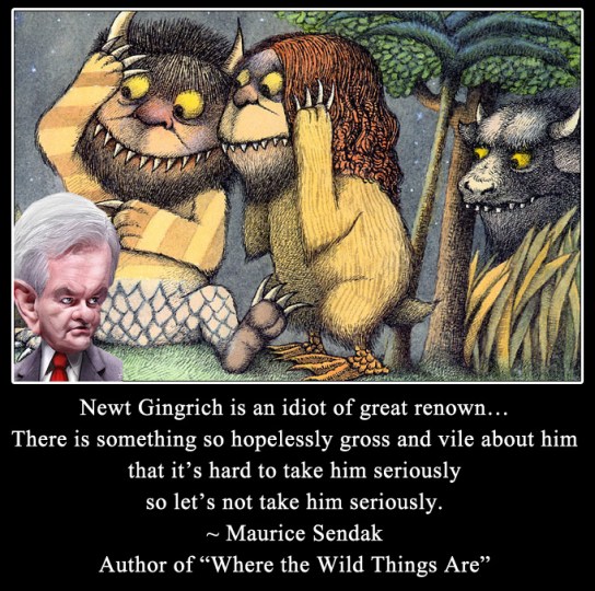 In memory of Maurice Sendak, 83, who died earlier due to complications from a stroke. This is a quote from his interview on the Colbert Report about Newt Gingrich, who was still running for the Republican Presidential Candidacy at that time.