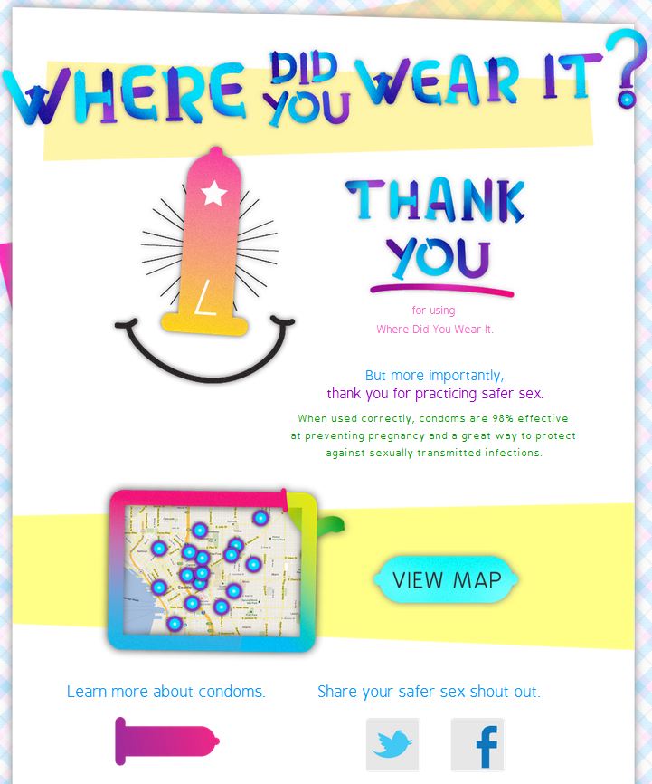 “Did you just use a condom to protect yourself against unintended pregnancy, HIV and other sexually transmitted infections? You go, tiger! Sex that (is) safe, should be shared,” declares the Web site.