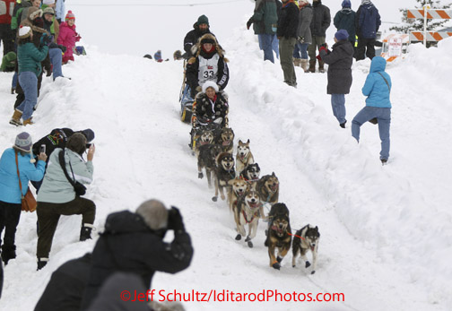 Saturday, March 3, 2012 Anna Berrington, her Idit-A-Rider, her handler and her dog team head down Cordova Hill during the Ceremonial Start of Iditarod 2012 in Anchorage, Alaska.