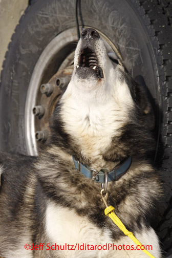 Saturday February 25, 2012 One of the dogs readying for the Junior Iditarod start at Knik Lake howls prior to the start.