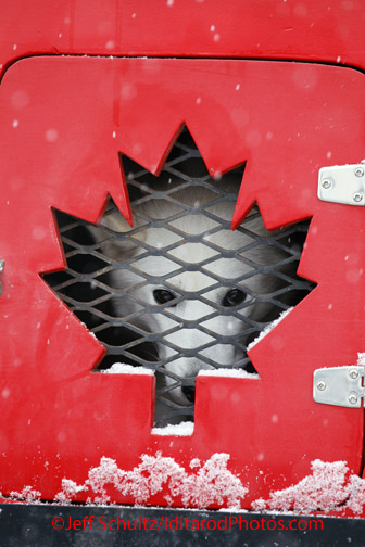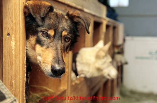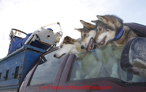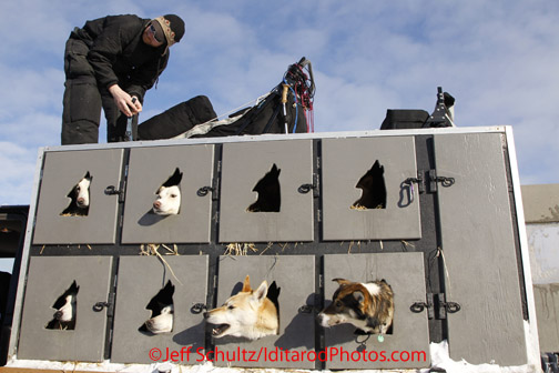 February 29, 2012. Tom Thurston’s dog, Guiness, with his teammats at the mandatory vet check at Iditarod HQ. The dogs are waiting inside Thurston’s dog transportation trailer for their turn to be inspected.