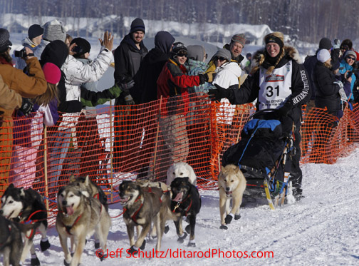 Sunday, March 4, 2012 Kristy Berrington high fives spectators in the starting chute during the restart of Iditarod 2012 in Willow, Alaska.