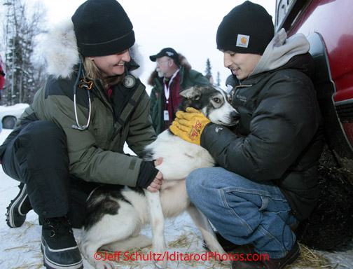 February 29, 2012. Vet Debra Lynn Volenec checks dogs at the mandatory vet check at Iditarod HQ.