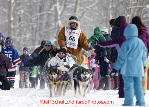 Saturday, March 3, 2012 Five-time Iditarod winner, Rick Swenson, shakes hands with fans at the Ceremonial Start of Iditarod 2012 in Anchorage, Alaska.