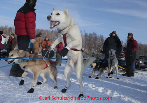 Sunday February 26, 2012 One of Conway Seavey’s dogs waits at the finish line after finishing in first place on the 2012 Jr. Iditarod