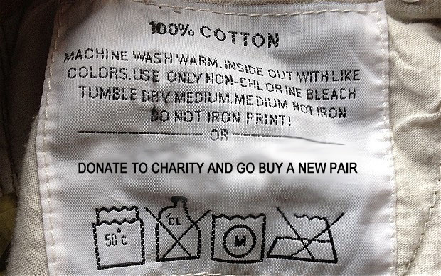 This same Huffington Post article also features a few photos of what they thought the labels should say such as “IF I AM PLEATED, JUST THROW ME AWAY,” “IN THE BEST RELATIONSHIPS, YOU BOTH WEAR THE PANTS,” and “I DO NOT BELONG ON THE FLOOR.” Personally, I thought their sayings were rather lame, so I created a few of my own….