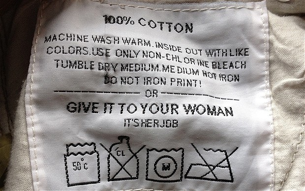 A British clothing company known as Madhouse has put a statement on the washing label, immediately underneath the washing instructions such as “Machine wash warm”, that says, ” – OR – GIVE IT TO YOUR WOMAN. IT’S HER JOB.”