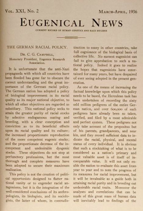 In this Eugenical News article, American Eugenics supports the efforts put forth in Germany: