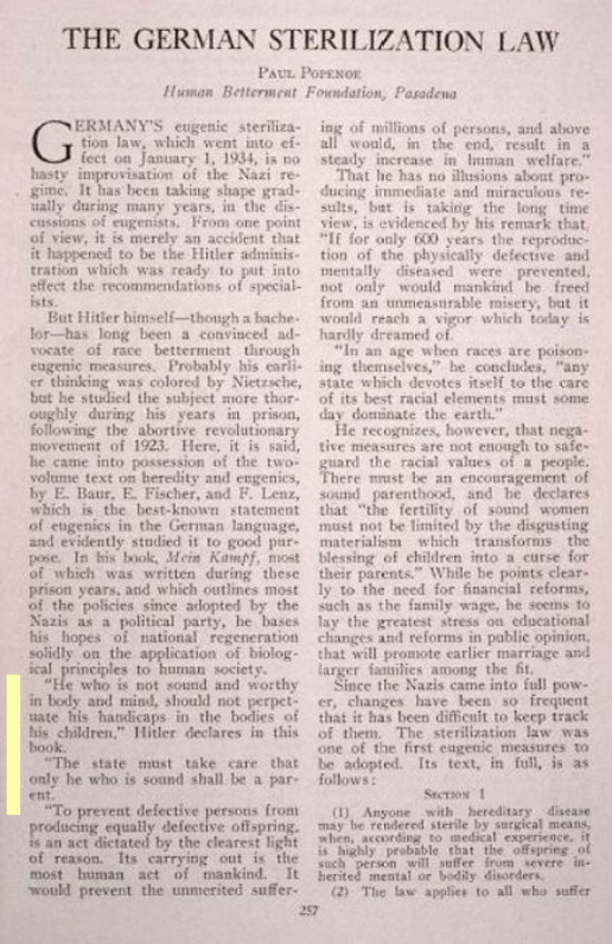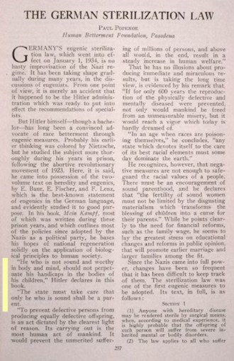 In “The German Sterilization Law,” by Paul Popenoe, Journal of Heredity (vol. 25), the author writes about how “[Hitler] has long been a convinced advocate of race betterment through eugenic measures.” Popenoe further writes about Hitler’s book: