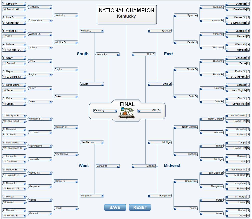March Madness is upon us. I wait for the NCAA’s every year, and once it is over, I go through serious withdrawals until next year. I have completed my picks – but this year was quite different for me… I did a lot of guessing. My bracket is below.