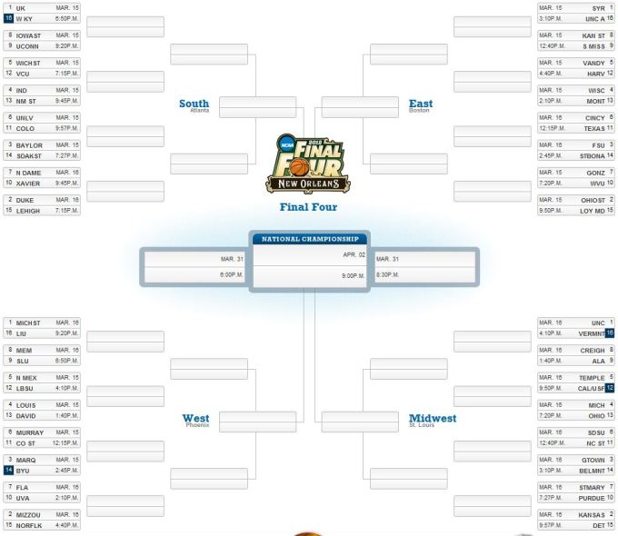 NCAA March Madness Men’s Basketball 2012 Bracket with all 64 teams including date and time of First round play. Click on the image to enlarge.