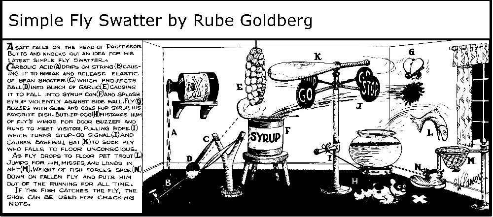 If you are not familiar with the Rube Goldberg, it is a contest to build a complicated feat of engineering to perform a very simple task. The contest was named after Rube Goldberg, a United States cartoonist who drew intricate diagrams of very complicated and impractical contraptions that accomplished little or nothing (1883-1970). In this contest (video below), the machine simply had to blow up a balloon and pop it. That’s it.