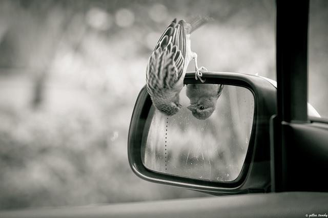 I like it! 🙂 Especially since it reminds me of a guy I used to work with, who brought a brand new Ford F-150 pickup truck – and then was losing his mind, because every late afternoon when he drove his new pride and joy home and parked it in the driveway, this deranged male Robin would get into a vicious fight with his own reflection in the drivers side mirror. Then to show his contempt for his “rival”, the bird would perch on top of the mirror and shit all over it, making a disgusting mess, irritating the hell outta my friend, and ruining his peace of mind.
