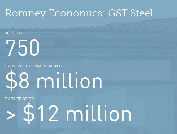 Kansas City’s GST Steel was a successful company that had been making steel rods for 105 years when Mitt Romney and his partners took control in 1993. They cut corners and extracted profit from the business at every turn, placing it deeply in debt. When the company eventually declared bankruptcy, workers were denied their full pensions and health insurance, and the federal government was forced to step in and bail out the pension fund.