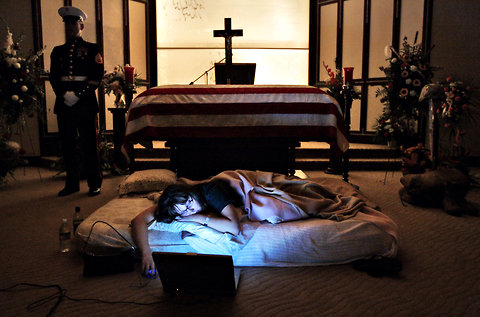 For the past several years, two photos takes top spot in circulation – on blogs, on social media sites, it is shared and “liked” over and over. Taken by the photographer Todd Heisler, from his 2005 award-winning series for the Rocky Mountain News, “Jim Comes Home,” which documents the return and burial of Marine Second Lt. Jim Cathey, who lost his life in Iraq, this first photo shows his pregnant widow Katherine lying on an air mattress in front of his coffin. She’s staring at her laptop, listening to songs that remind her of Jim. Her expression is vacant, her grief almost palpable.