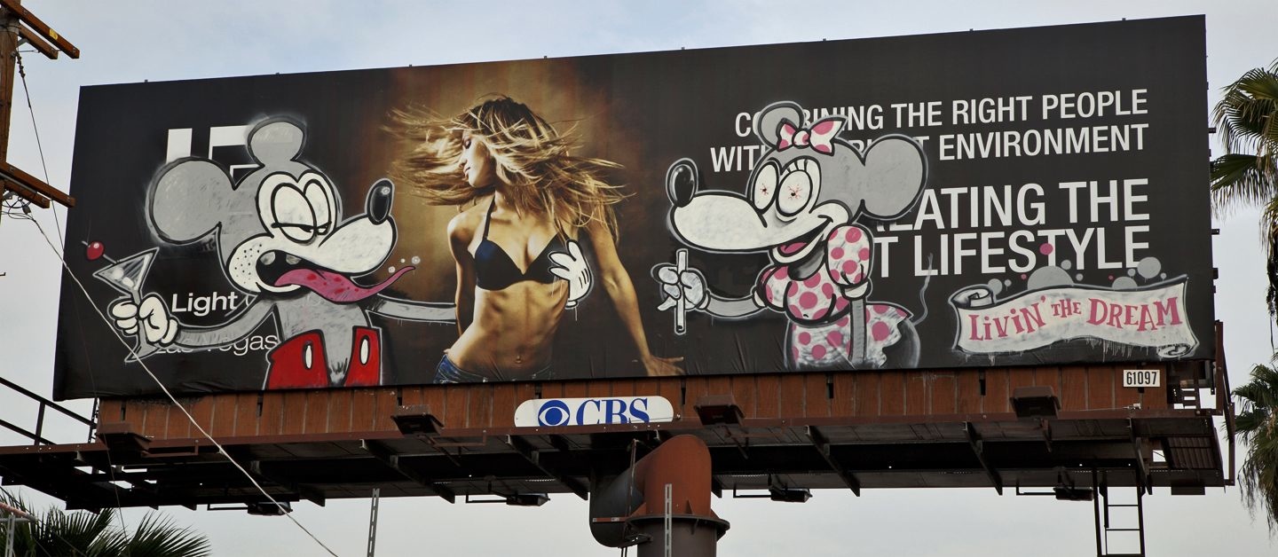 “Graffiti artist Banksy notably altered a billboard in Los Angeles prior to the Academy Awards in February 2011, in hopes of calling attention to the nomination of his documentary ‘Exit Through the Gift Shop.’ A rather lecherous Micky Mouse, cocktail in hand, was painted onto an existing billboard along with a drugged-out Minnie Mouse and a banner reading, ‘Living the Dream.’ It was quickly removed.”