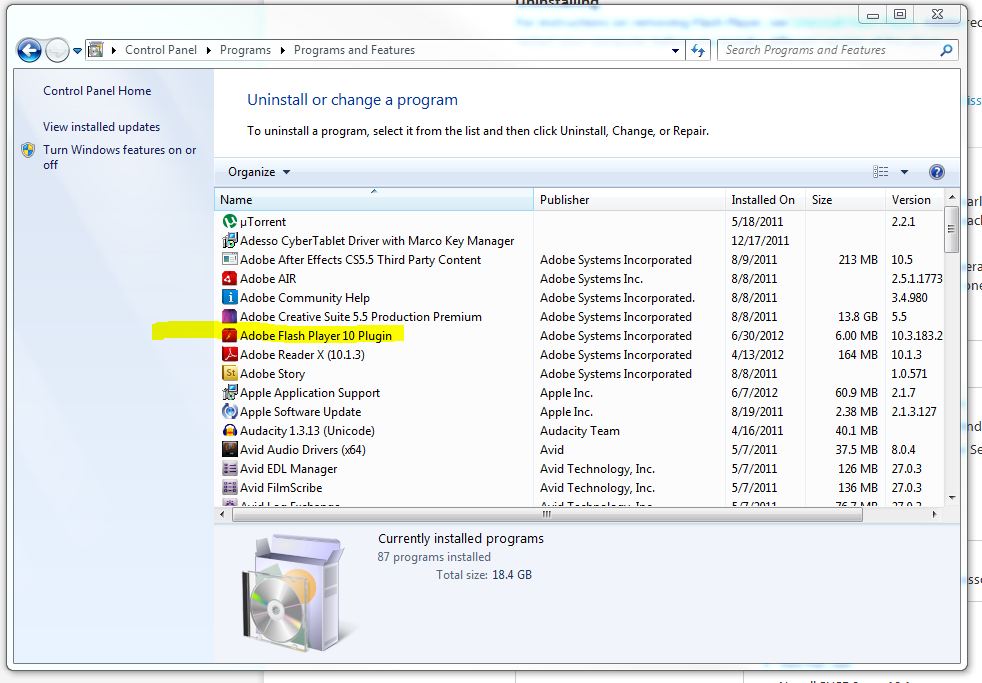 • Click on Adobe Flash Player 11 plugin (My snapshot below shows ver. 10 because I already uninstalled 11 and reinstall 10.3)